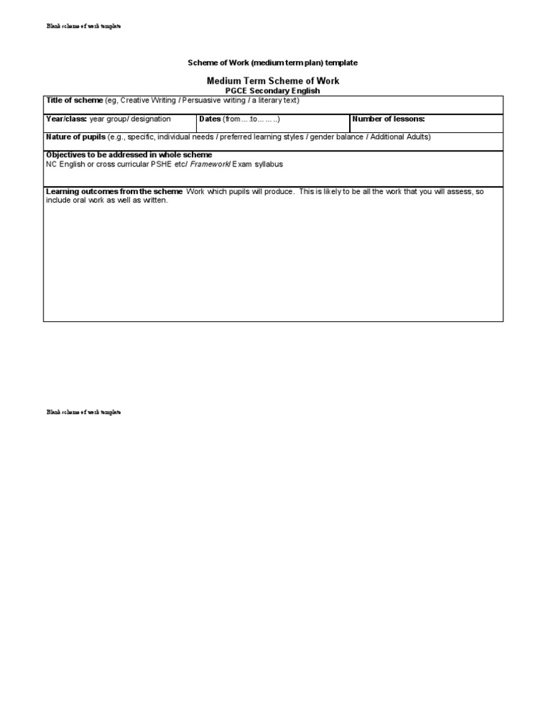 Blank Scheme Of Work Template. A good settlement of advantages and preferences can be dexterous by individuals who utilize a Blank Scheme Of Work Template. These templates are for the most share proficiently planned by broadly known organizations gone unbelievable looking illustrations and highlights. In the situation that you glance around, you'll revelation that all is marked. From a little container to a huge office put on an act area, all single matter will undoubtedly have at any rate one mark. Naming things is valuable, easy and functional, and the applications are basically interminable. You can locate a broad assortment of names accessible available, in various shapes and sizes, styles, plans, hues, materials, template, etc.